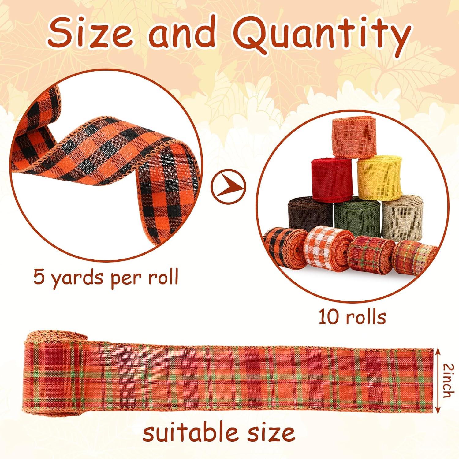 Whaline 10 Rolls 50 Yard Fall Plaid Burlap Ribbon 1 Inch Decorative Wrapping Ribbon for Autumn Thanksgiving DIY Crafts Bow Wreath Making Supplies(2 Inch)
