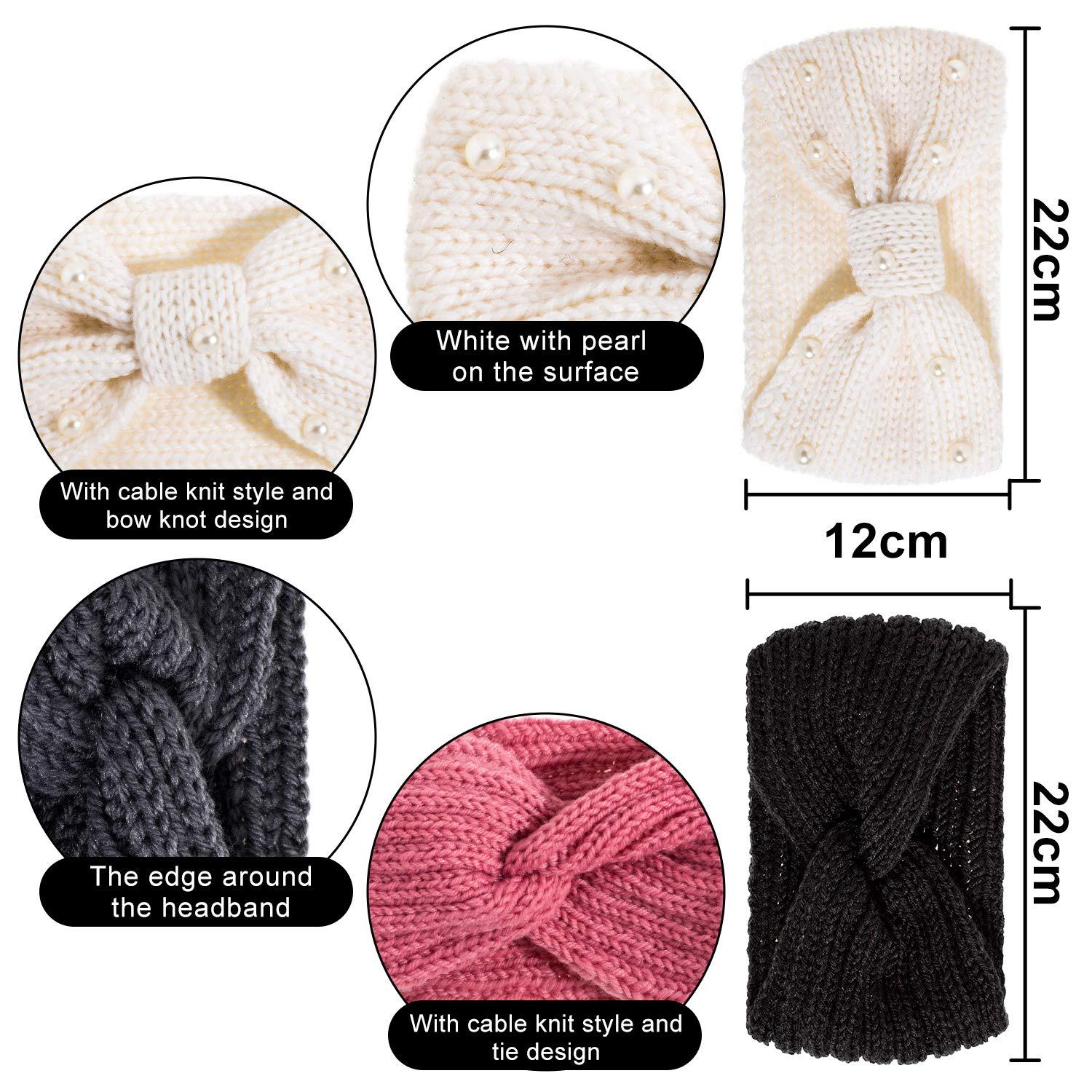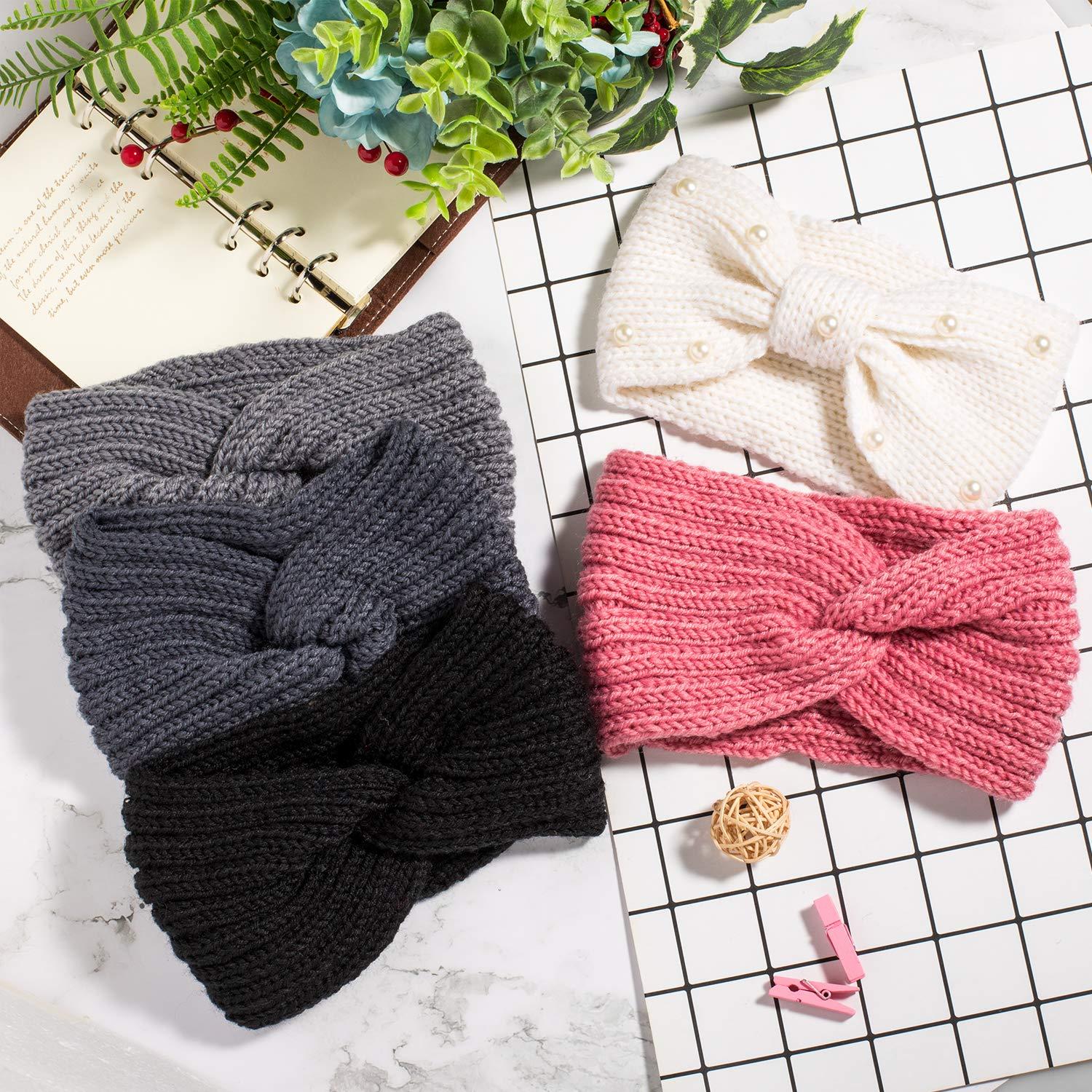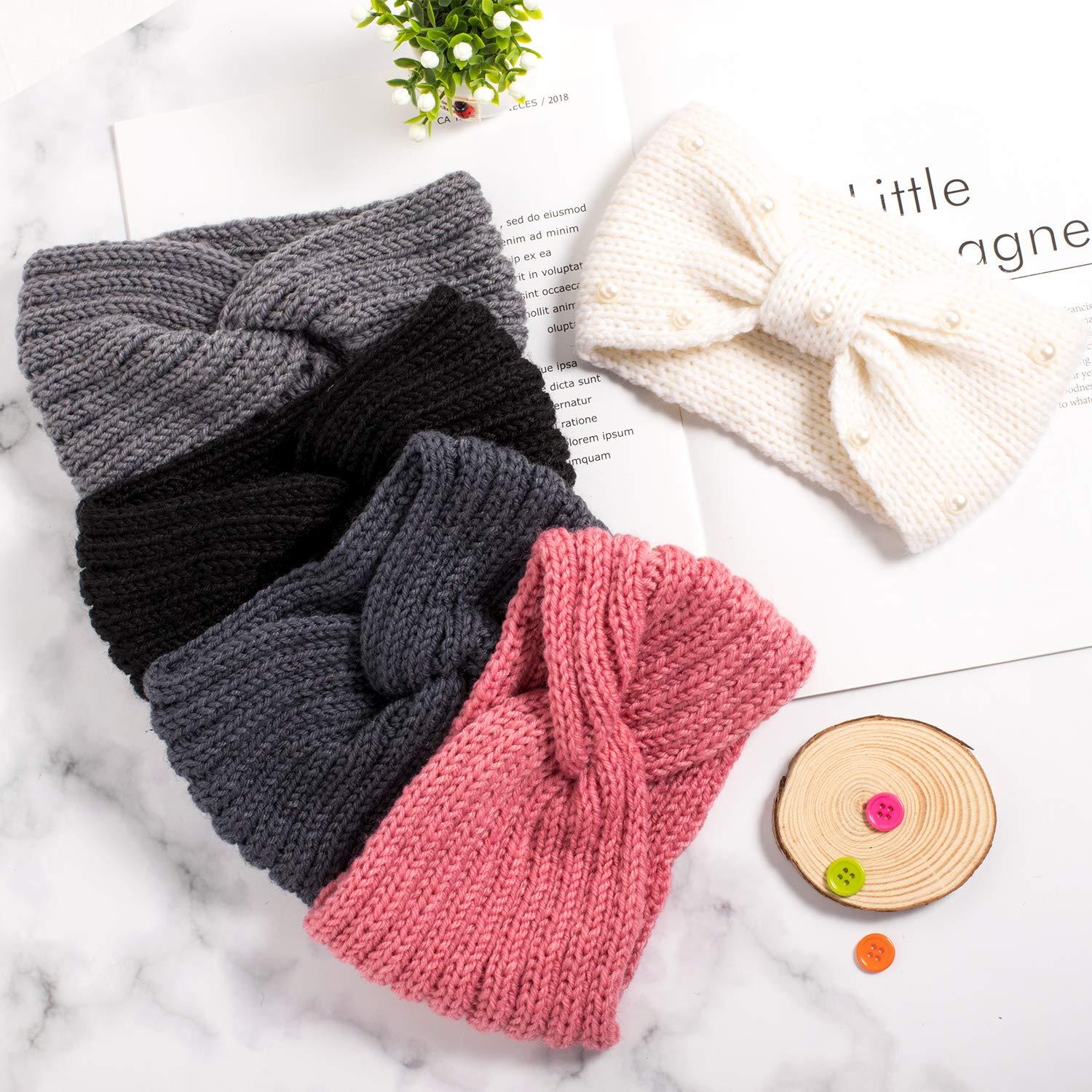 Whaline 5 Pieces Winter Knit Headbands Chunky Knit Headbands,4 Elastic Turban Head Wraps and 1 Pearl Crochet Hair Band, Ear Warmer Crochet Head Wraps for Women Girls (Autumn&Winter Colors)(Blue Pink Colors)