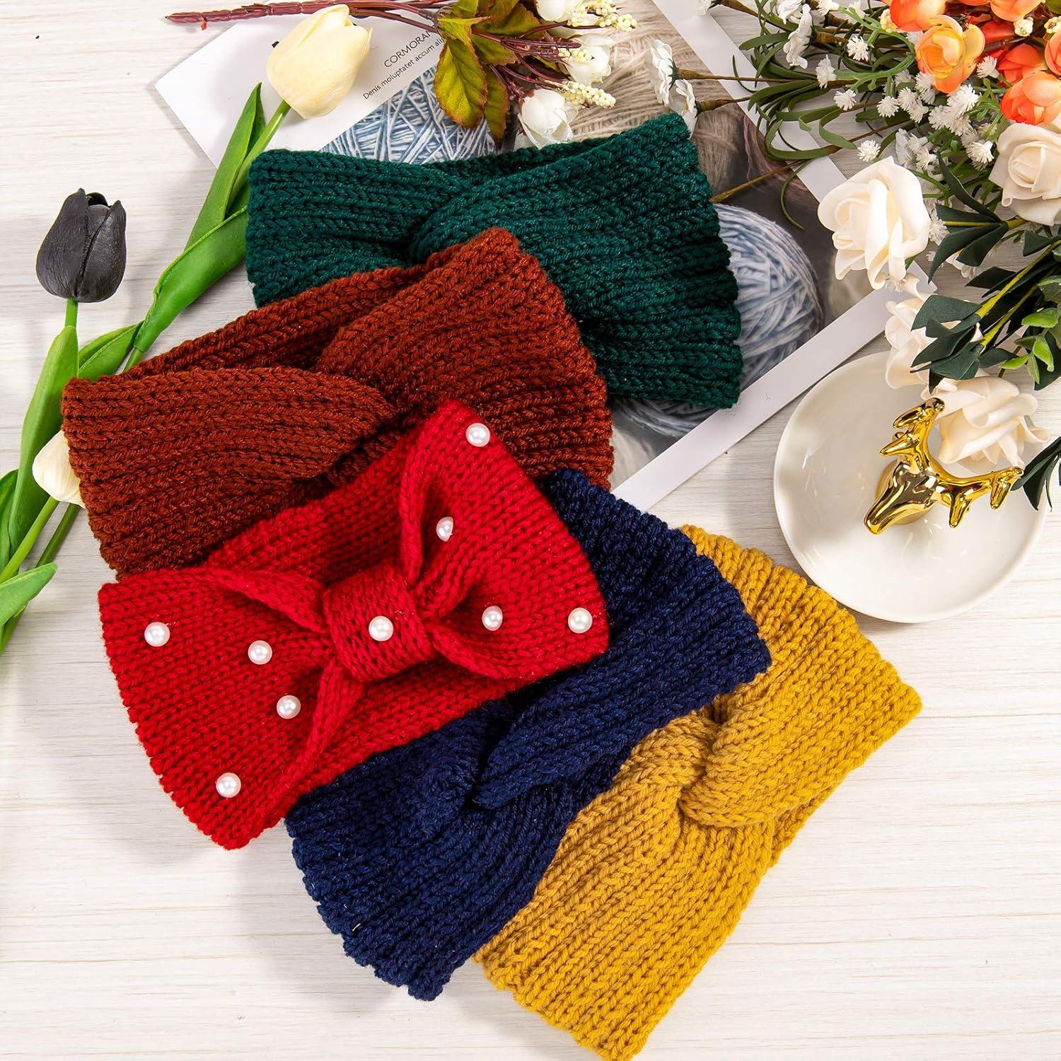 Whaline 5 Pieces Winter Knit Headbands Chunky Knit Headbands,4 Elastic Turban Head Wraps and 1 Pearl Crochet Hair Band, Ear Warmer Crochet Head Wraps for Women Girls (Autumn&Winter Colors)(Bright&Dark Colors)